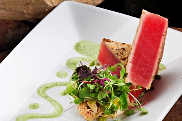 Cajun crusted tempeh with Lemon-Caper-Dill Cream and braised collard greens.